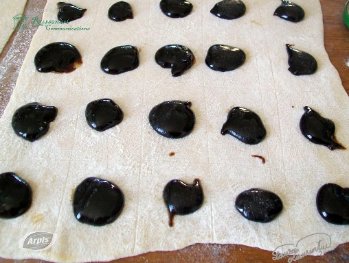 Cu pensula înmuiată în albușul puțin bătut se trasează liniile ce delimitează pătratele, se unge și de jur împrejurul foii de aluat. Deasupra se așază cealaltă foaie de aluat, se presează bine deasupra porțiunilor unse cu albuș, ca să se lipească. Marginile, eventual, se presară cu puțină făină (daca e nevoie). Urmând liniile unde cele doua foi de aluat s-au lipit între ele, se taie cu rola de patiserie (sau cu un cuțit bine ascuțit) în pătrățele.