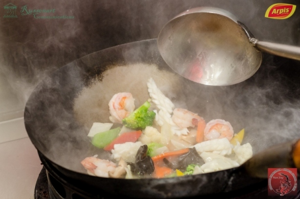 Într-un woc se pune apă, iar când aceasta dă în clocot se adaugă calamarul, creveţii şi restul ingredientelor (mai puţin ghimbirul, usturoiul şi oțetul de orez) se lasă pe foc, iar apoi se pun la scurs. Într-un alt woc se adaugă câteva picături de ulei Arpis, se pune la călit ghimbirul tocat mărunt, usturoiul şi se adaugă oţetul de orez. Se pune apoi supa de legume şi se leagă cu amidon. La sfârşit, se adaugă zahărul, sarea, piperul şi alte amestecuri de condimente, după gust.